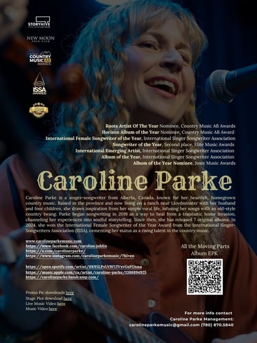 Since then, Caroline Parke has continued to build her catalog, releasing multiple albums that blend her love for classic country with a modern sensibility. Her songs often draw from the rhythms of ranch life, the joys and challenges of raising a family, and the quiet strength found in everyday moments. This authenticity has earned her a growing fanbase and critical acclaim within the industry. In 2024, her talent was recognized on an international stage when she received the prestigious International Female Songwriter of the Year Award from the International Singer-Songwriters Association (ISSA), a testament to her skill and dedication.